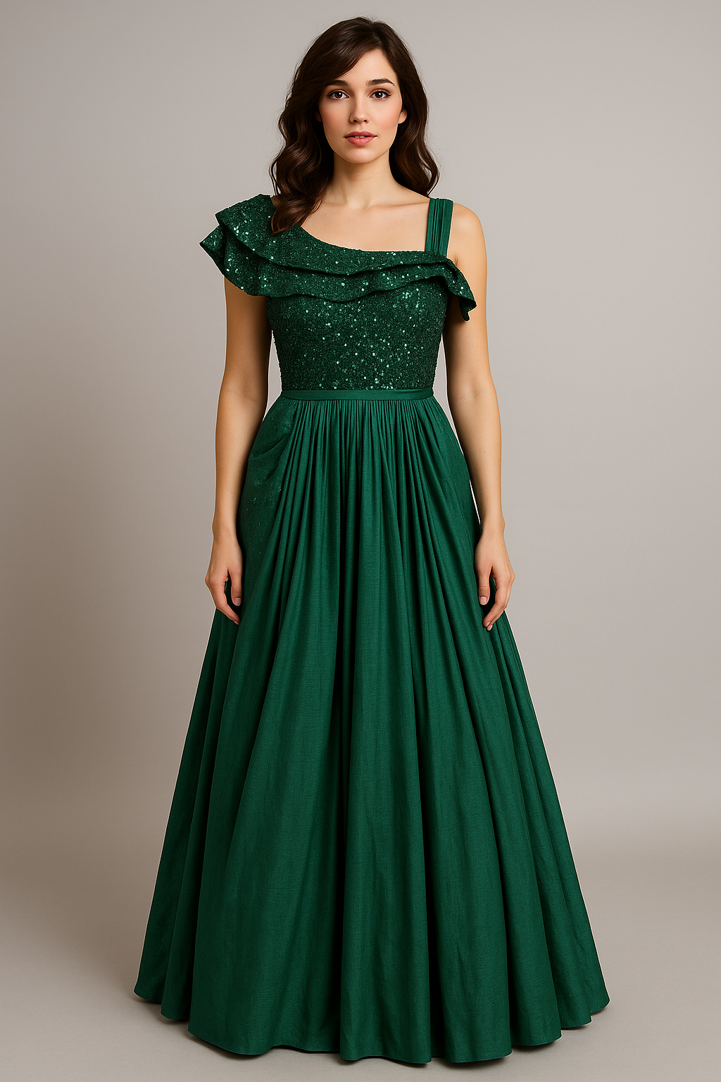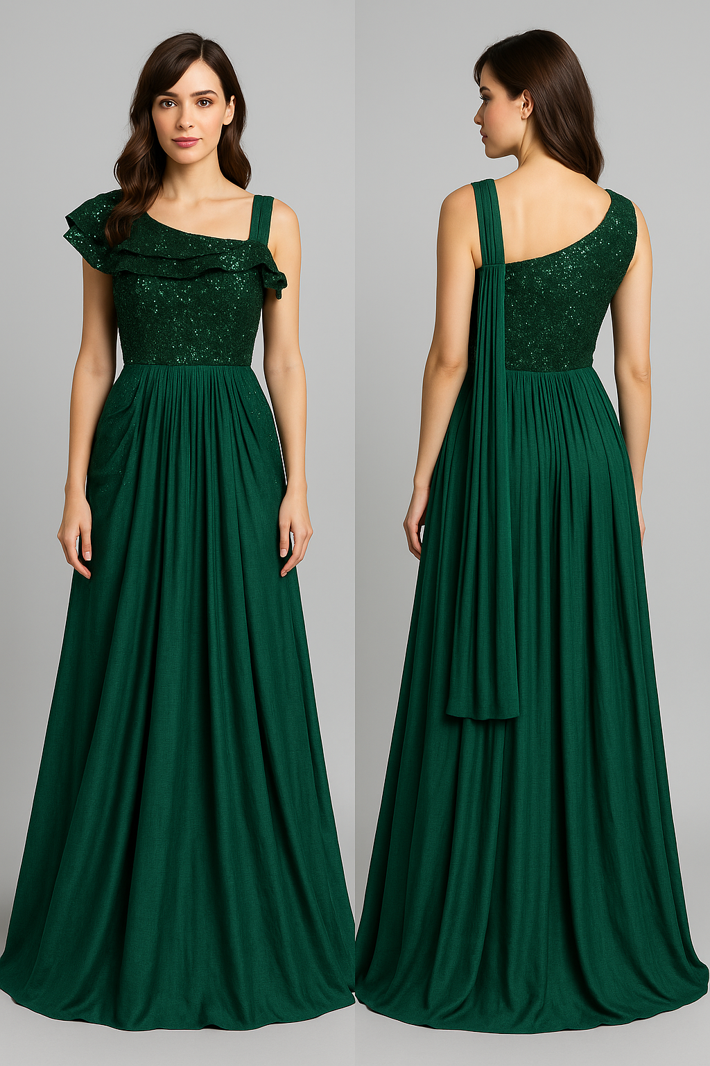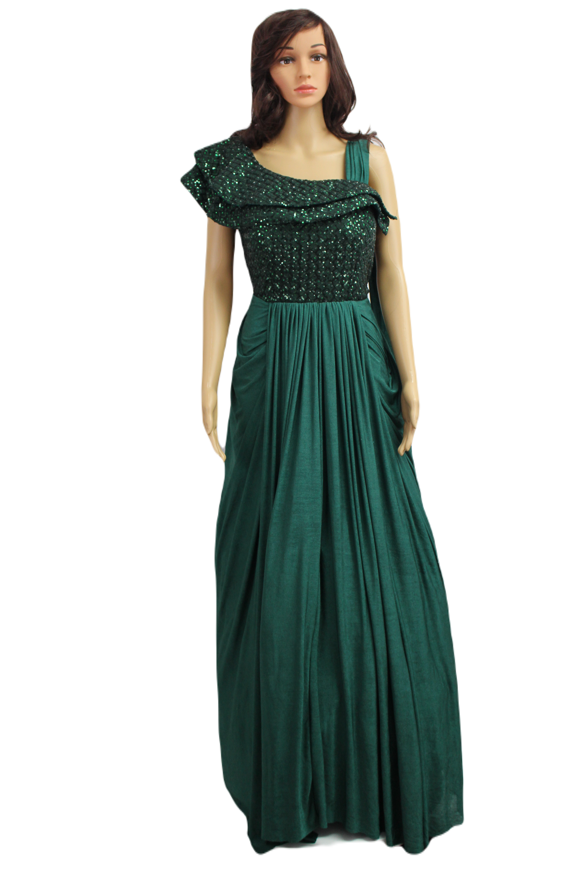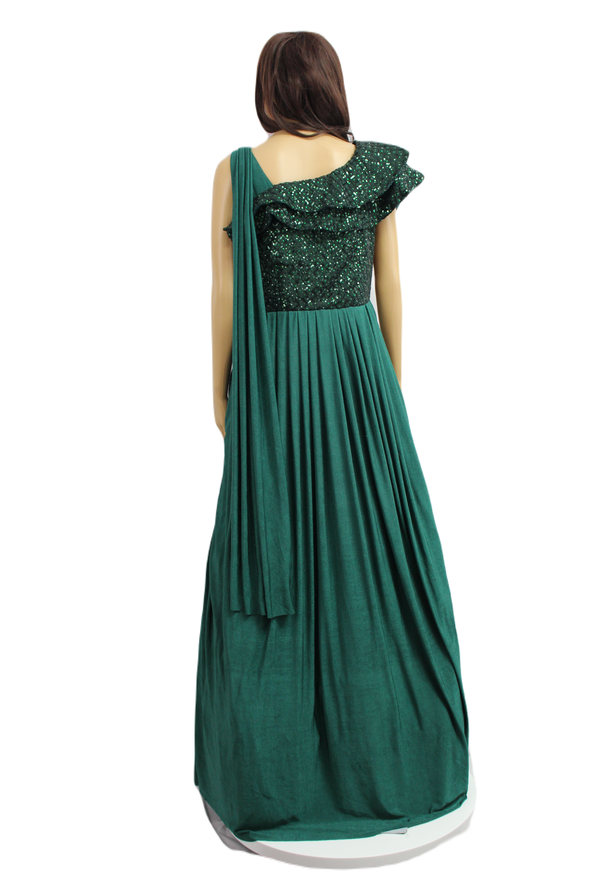 A simple and stand-out gown with sequined bodice in a drape style gown.