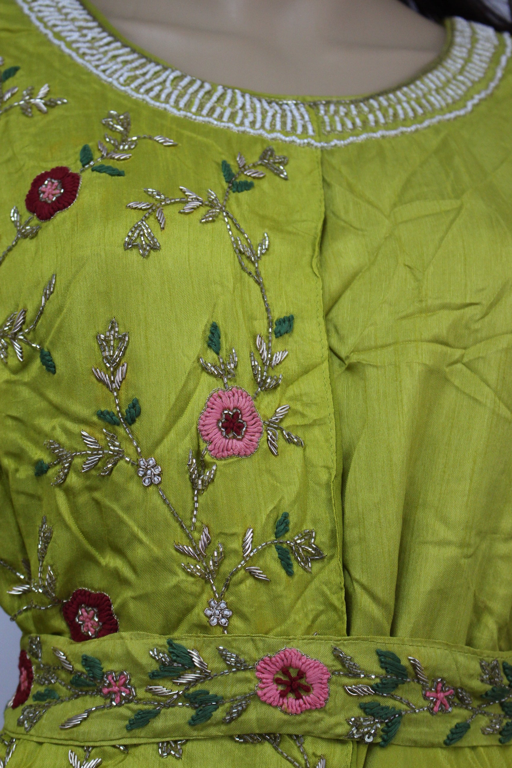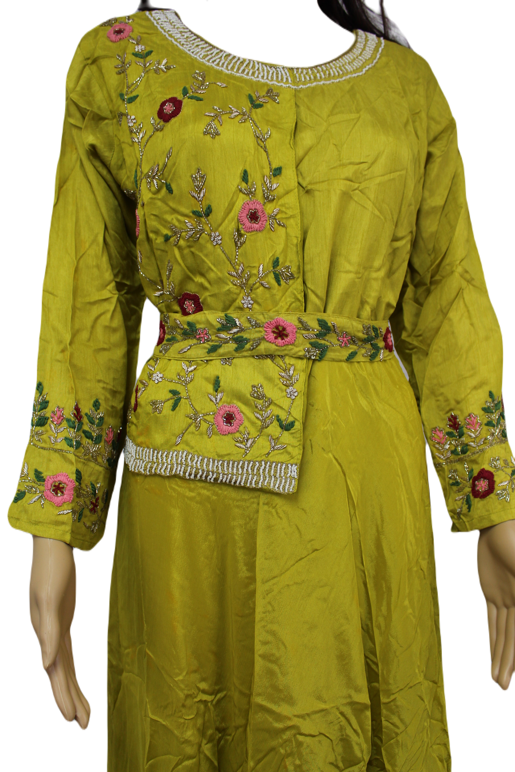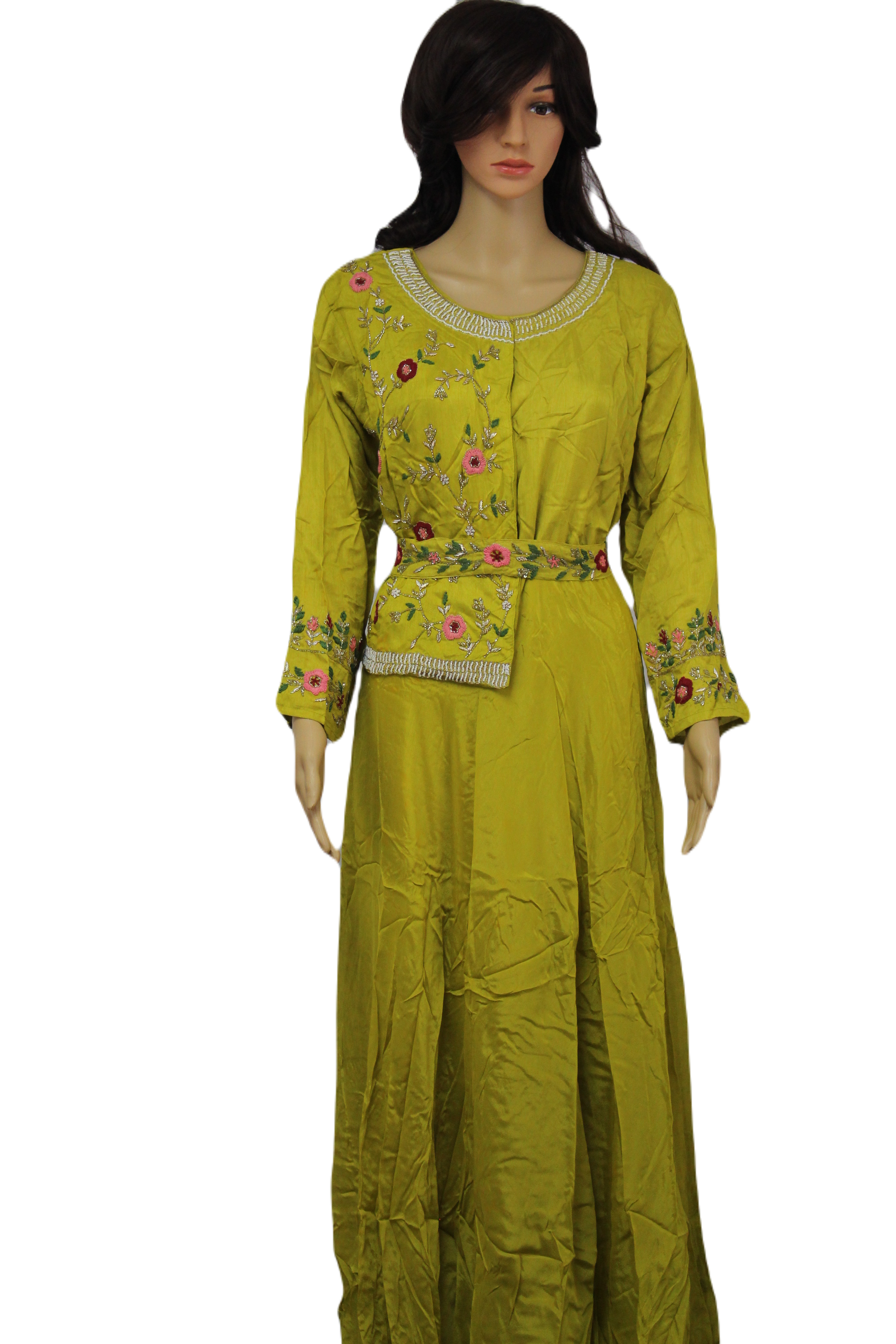 A pretty hand embroidered chartreuse colored maxi with handmade belt for any simple occasion.