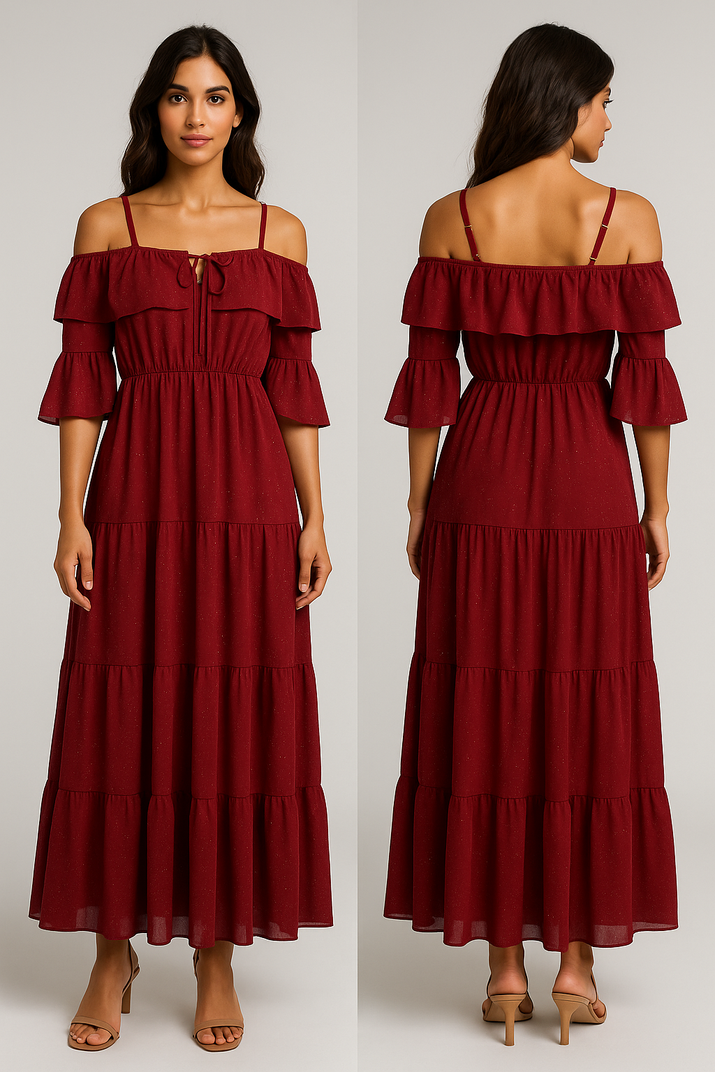 A simple and breezy off-shoulder gown made in pure georgette for a casual day out.