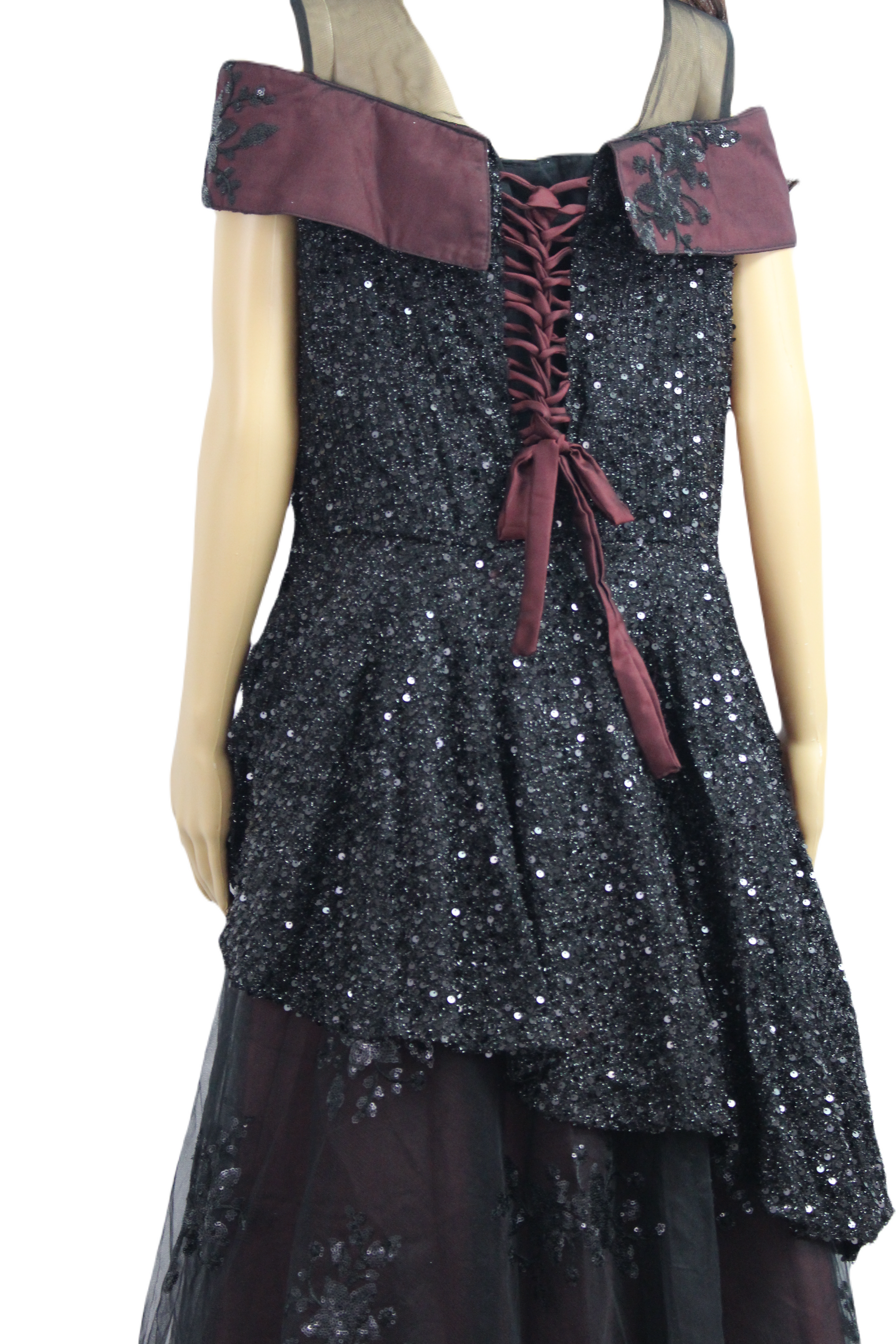 Dazzle in this simple yet glittering deep maroon with black sequined gown with adjustable corset type back.