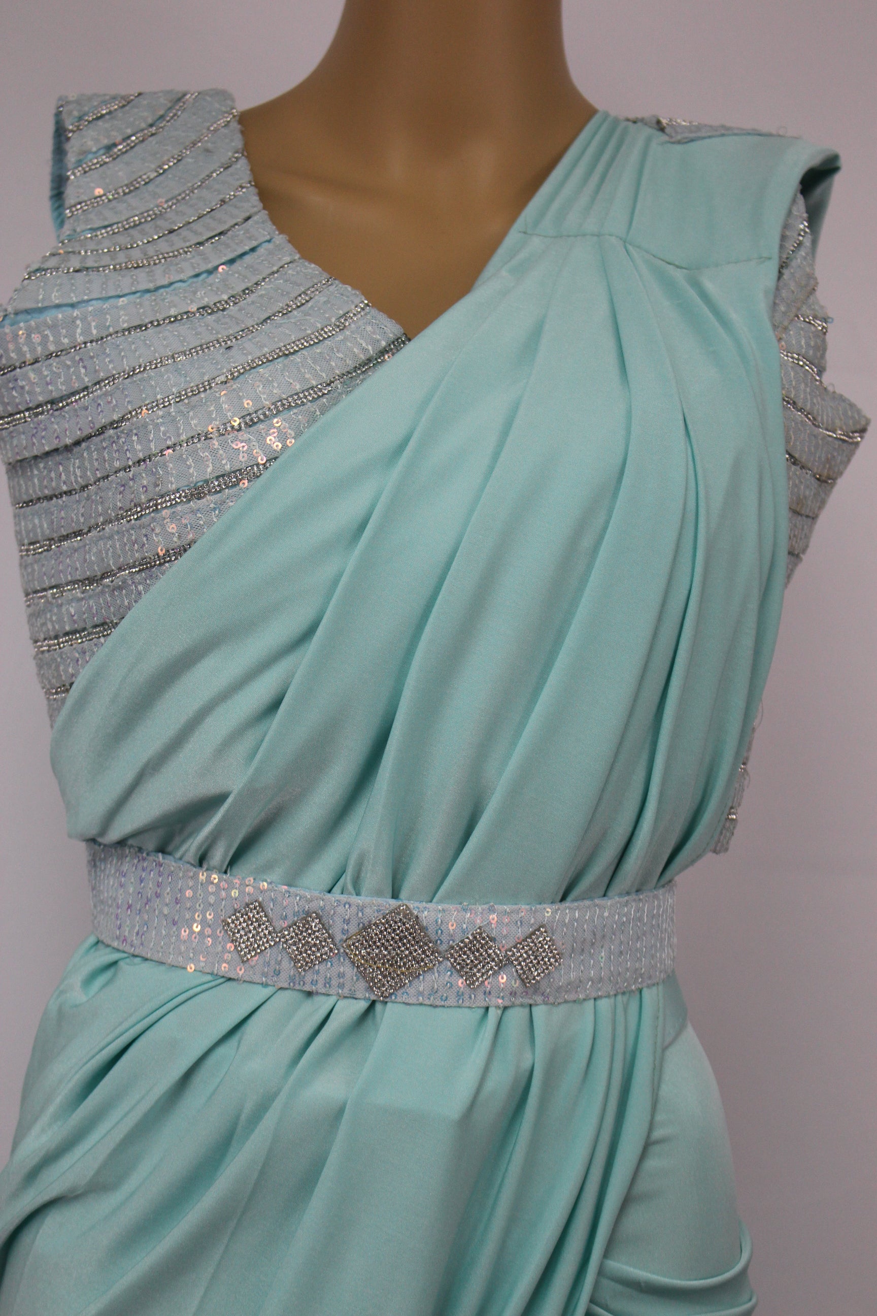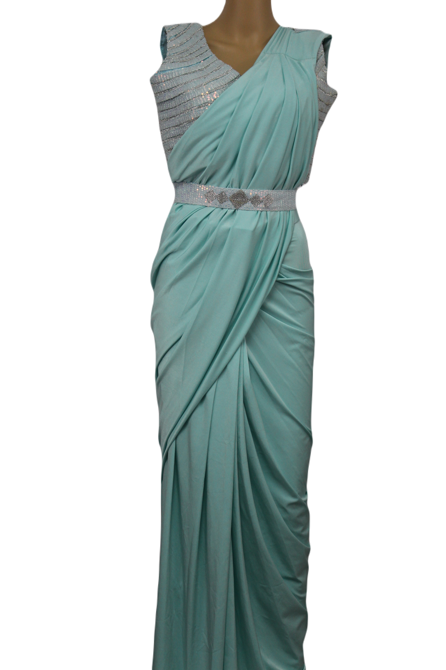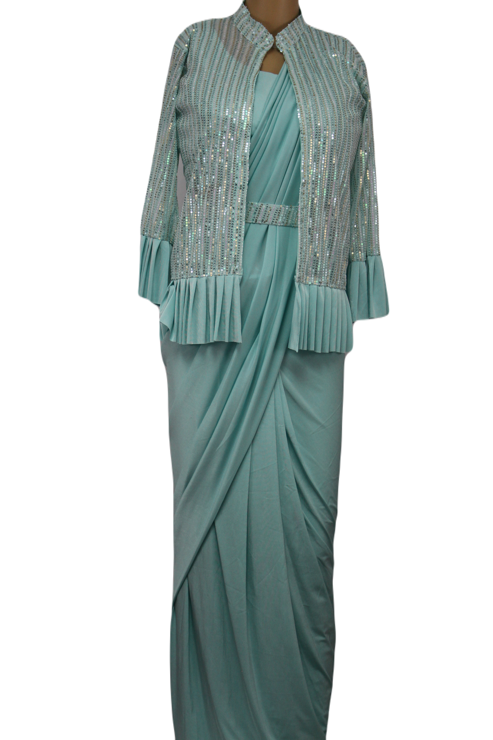 Ready to Wear Saree with Sequined Shrug in Aqua